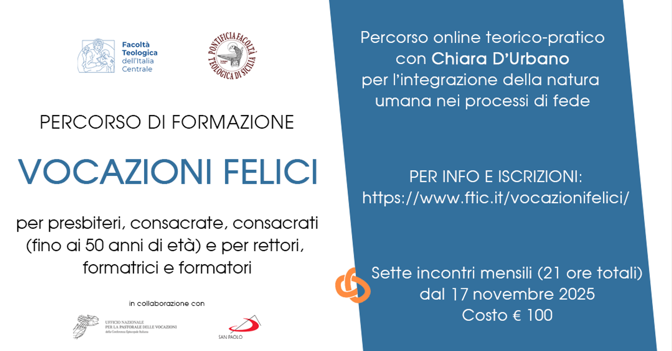 15 Ottobre 202510 Novembre 2025Nuovo percorso formativo: Vocazioni felici Le iscrizioni termineranno domenica 9 novembre La Facoltà Teologica dell'Italia Centrale e la Pontificia Facoltà Teologica di Sicilia propongono per quest'Anno Accademico 25/26 un percorso formativo tenuto dalla prof.ssa Chiara D'Urbano. Per informazioni vocazioni felici@teofir.it Vocazioni felici
