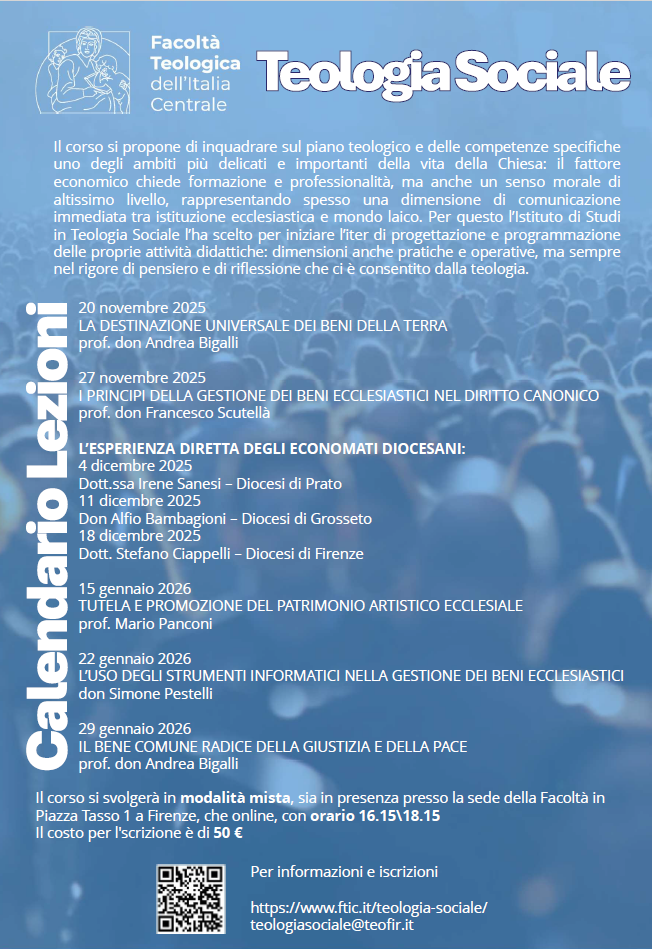 Giovedì 20 novembre avrà inizio il percorso formativo dell'Istituto di Ricerca in Teologia Sociale con il primo incontro tenuto dal prof. Andrea Bigalli ed avrà come tema: